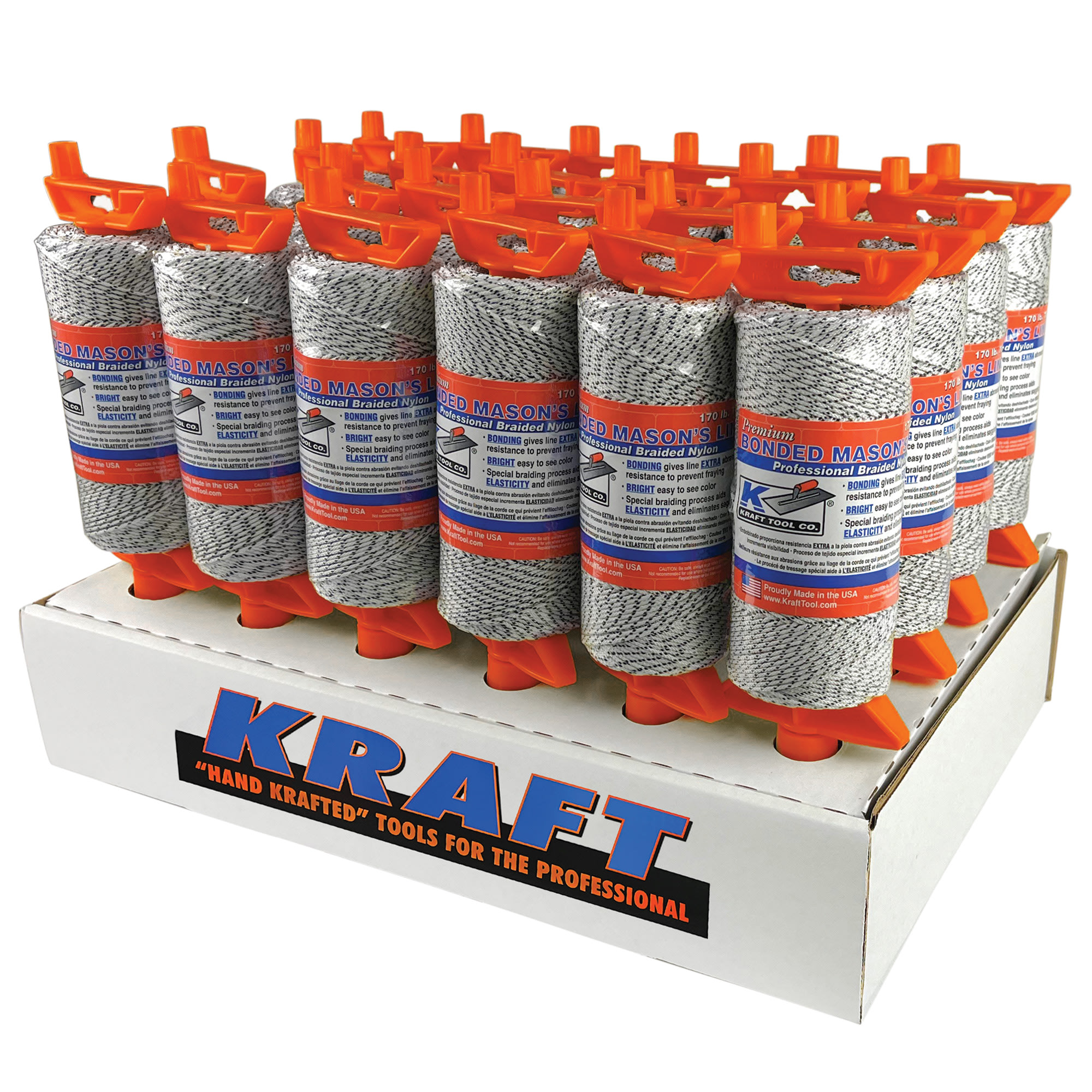 This display pack features 24 winder of 500' of the salt and pepper line is great as mason's line for a strong, tight line, or any odd jobs where a superior line is needed. Premium Bonded Braided Mason’s Line is the highest quality for all your line needs. The special braiding process creates extra elasticity which helps eliminate any sagging in this line making it perfect for laying out even rows of block and brick. The nylon line won't mildew, nor be affected by oil or mortar. The nylon material won't absorb water or see the effects of moisture and humidity like other lines. The strong, tough line is braided with a black fleck braid of distinction making it easy to spot in your toolbox. The tight braid can be pulled taut along block and line holders for a straight accurate line. The line then goes through a special bonding process which adds extra abrasion and alkali resistance. The bonded line is better at securely holding knots. The line stands up to the abuse of a job site from trowels striking it. The line is tested to 170 lbs. for superior hold. The free-spinning plastic winder holds the line in line in place keeping it handy and untangled. The large winder includes 500' of line so there is less stopping during jobs to get more line. The plastic winder lets the user unwind and wind the line for repeated use making it popular for use in surveying and landscaping. The bright yellow EZ-Winder is easy to spot on the jobsite. The top of the winder has a hang hole for easy storage when not in use. Display pack of 24 winders.