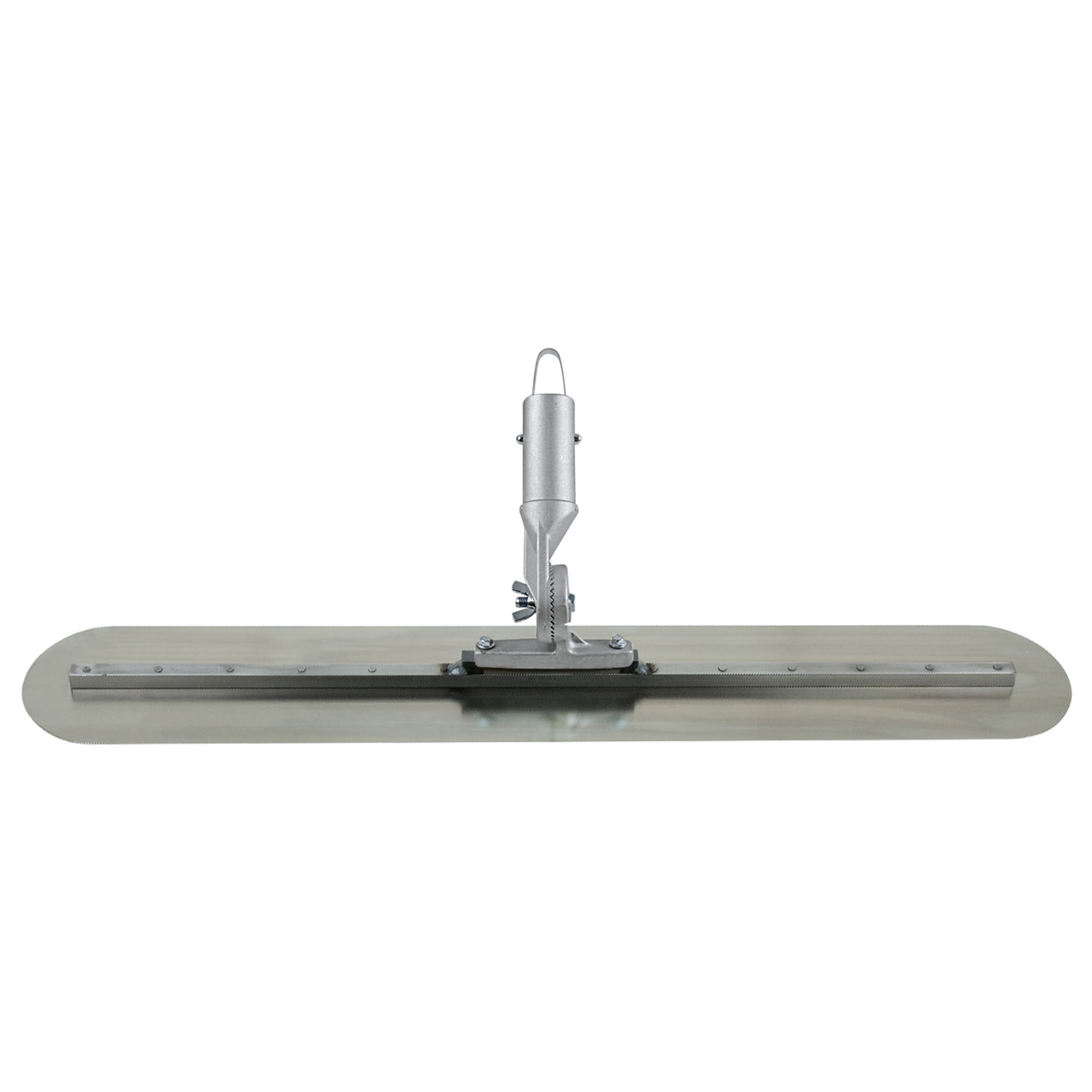 This 4-1/2' fresno trowel is made with high quality tempered carbon steel for a perfect finish. Use this quality fresno to finish concrete to a smooth, hard surface. Round ends on the 5" blade eliminate gouging of concrete for a smooth finish. A 39" long 1/2" square steel mounting is centered on the 42" blade to help keep the trowel flat. A strong cast aluminum bracket is attached to the fresno. Uniquely designed bracket has teeth to keep handle at set angle without slippage. Single tilt bracket moves handle 180 degrees for back and forth movements. Use with 1-3/8" or 1-3/4" button bull float handle. Other 2-hole brackets can be used, if desired. Attach one or more groover bits (sold separately) to turn this tool into a groover for more versatility.