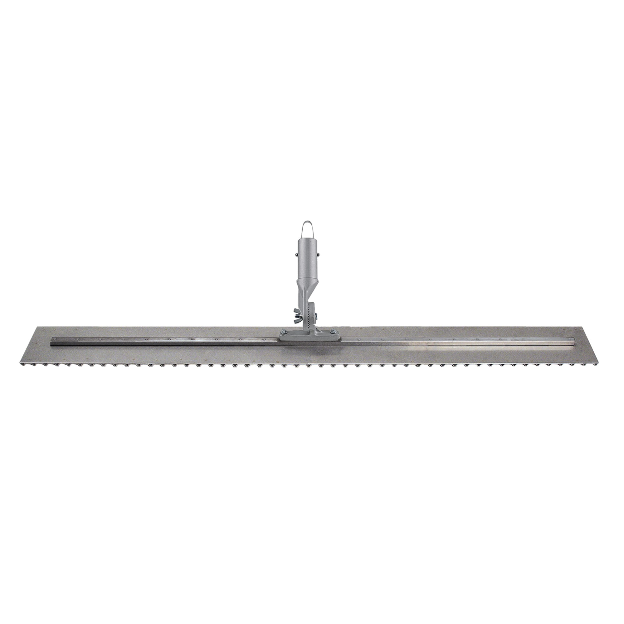 A popular tool to create non-skid surfaces on safety ramps, highways, bridges, and driveways. The Multi-Trac Groover produces a uniform rough groove surface on roads and ramps to keep water flowing off the surface and provide traction. This high quality #18 gauge stainless steel blade ensures an extra smooth working surface for a quality finish. The 5" wide blade moves smoothly through concrete. The 3' long fresno creates 1/4" deep, 1/4" wide grooves 3/4" apart on center. These parallel lines provide a safety tread effect on high traffic areas such as ramps, driveways, and sidewalks. The square ends of the fresno allow the user to work against forms and walls for even coverage. A 33" long 1/2" square steel mounting is centered on the 36" blade to help keep the trowel flat. A strong button cast aluminum bracket is attached to the fresno. Uniquely designed bracket has teeth to keep handle at set angle without slippage. Single tilt bracket moves handle 180° for back and forth movements.